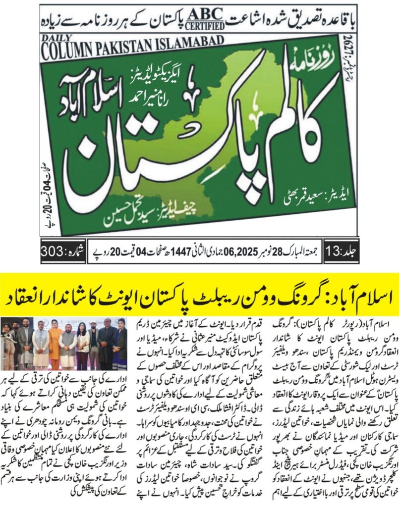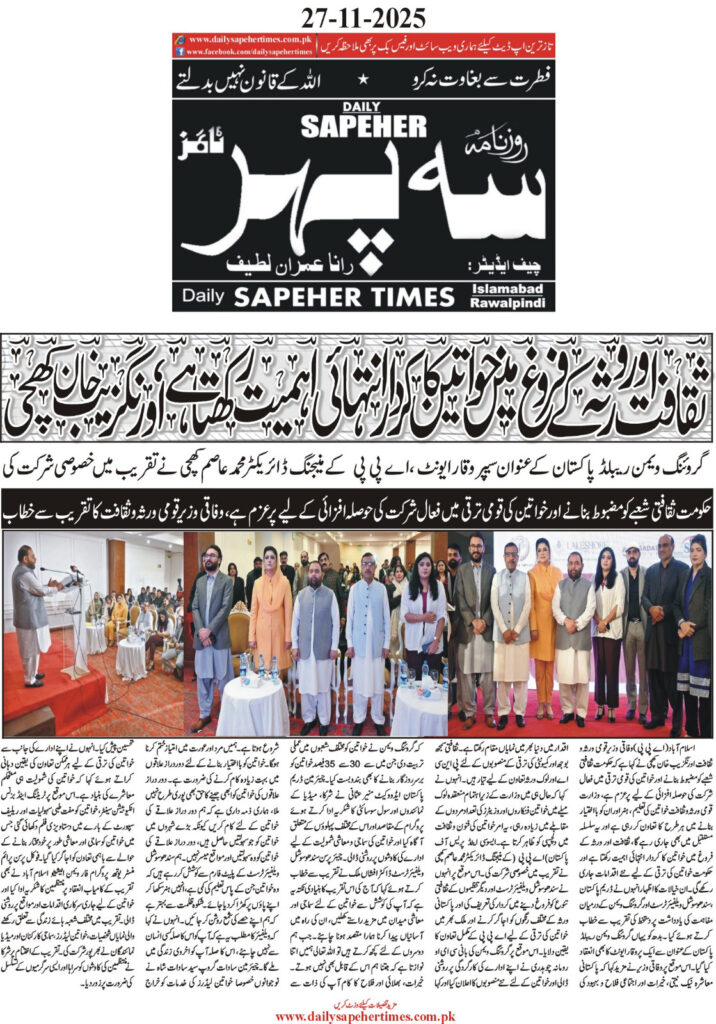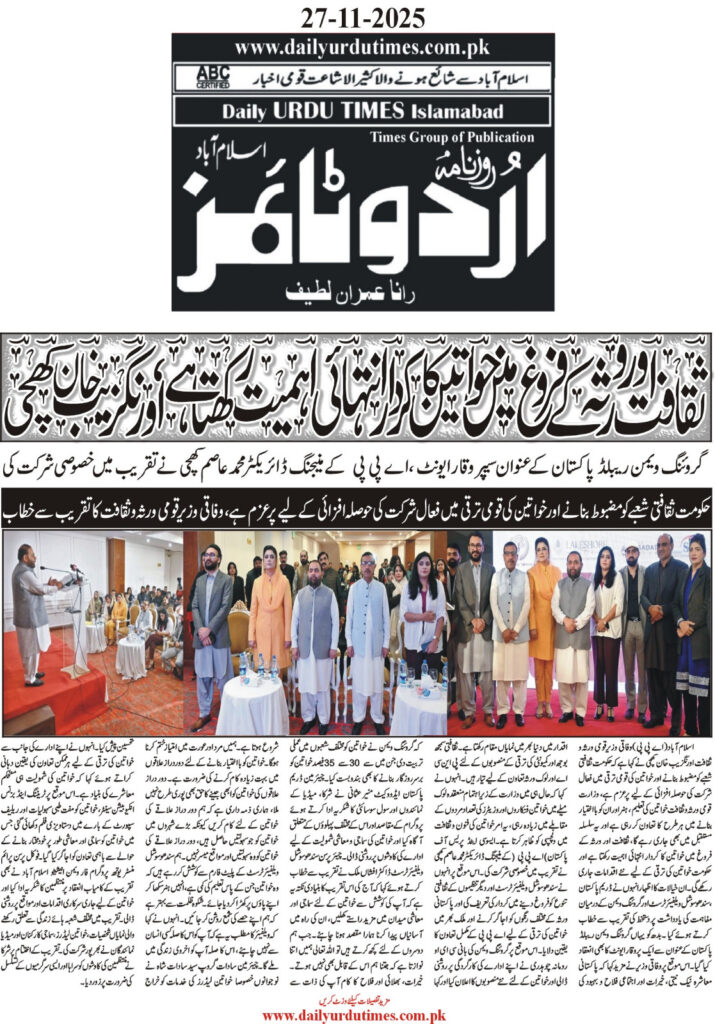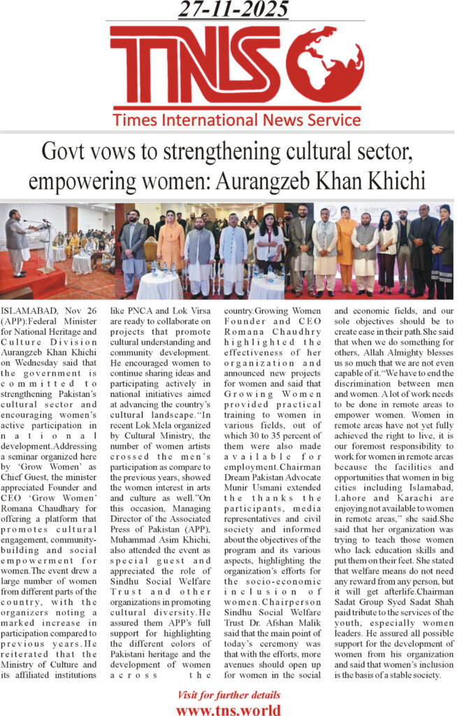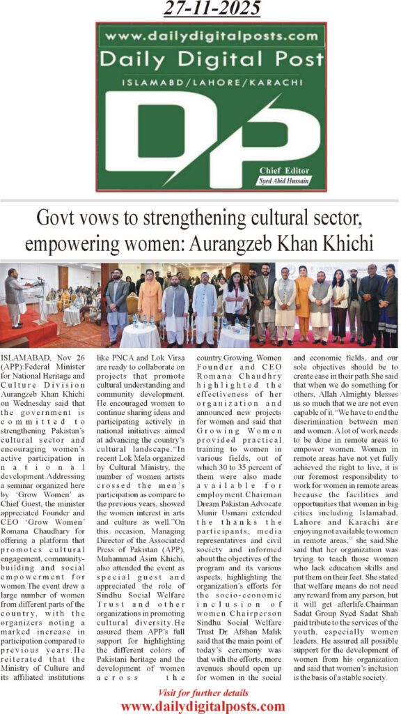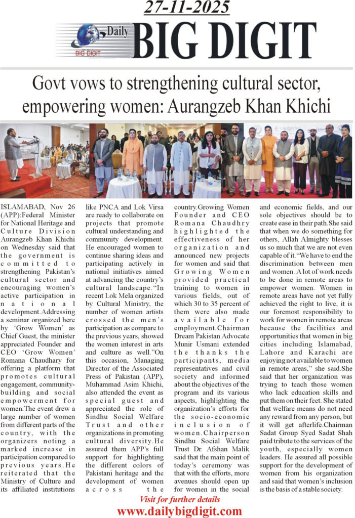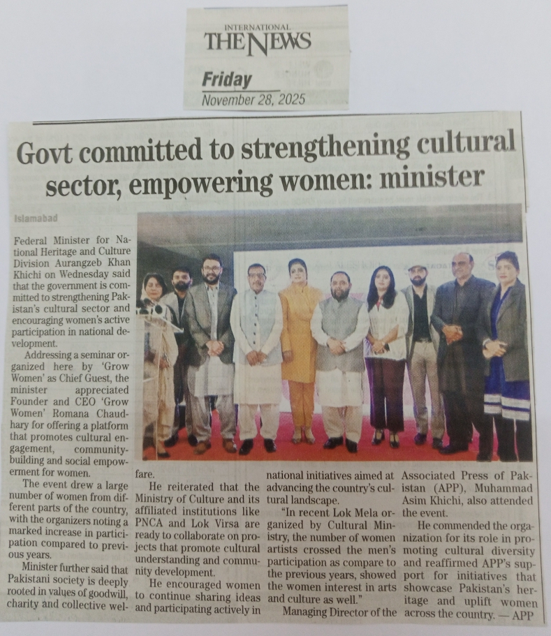 Speaking as the Chief Guest at a seminar organized by Grow Women, the minister praised Founder and CEO Romana Chaudhary for creating a platform that advances cultural engagement, community development, and women’s empowerment across the country.