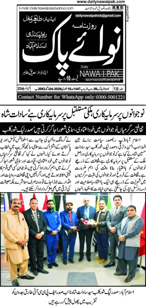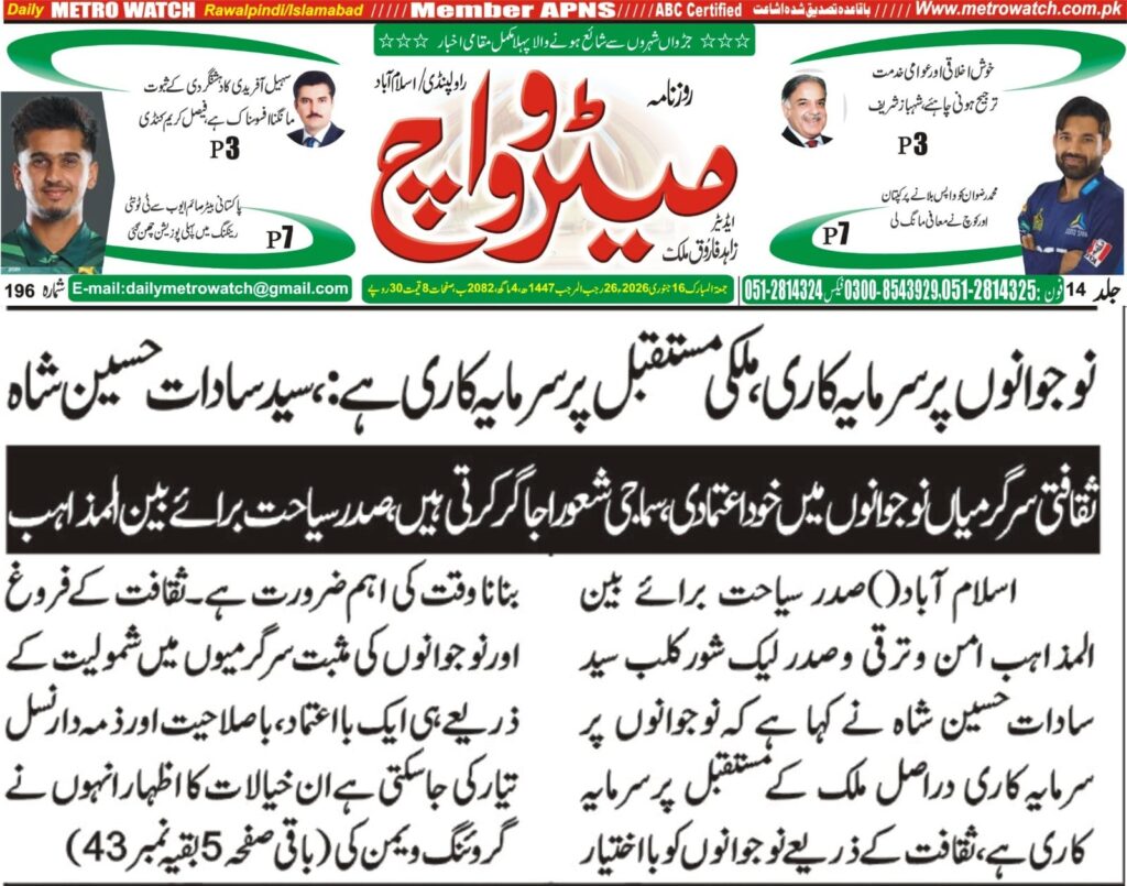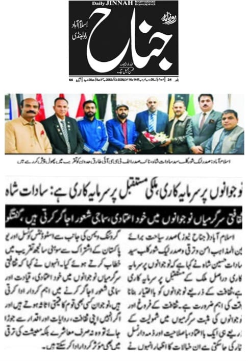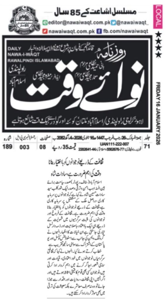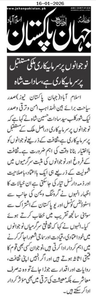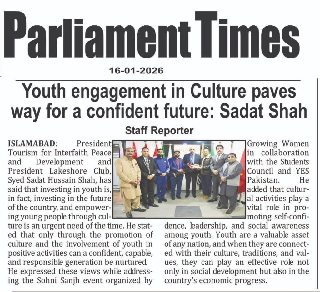 President Tourism for Interfaith Peace and Development and President Lakeshore Club, Syed Sadat Hussain Shah, has said that investing in youth is, in fact, investing in the future of the country, and empowering young people through culture is an urgent need of the time.